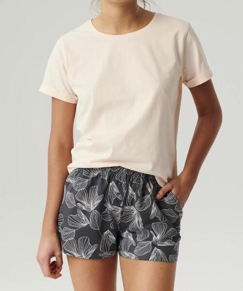 Női pamut pizsama - rövid ujjú - félkör alakú nyakkivágás - mintás rövidnadrág - kényelmes zsebek az oldalán - elasztikus derékrész pamuttal bélelve Összetétel: 100% pamut