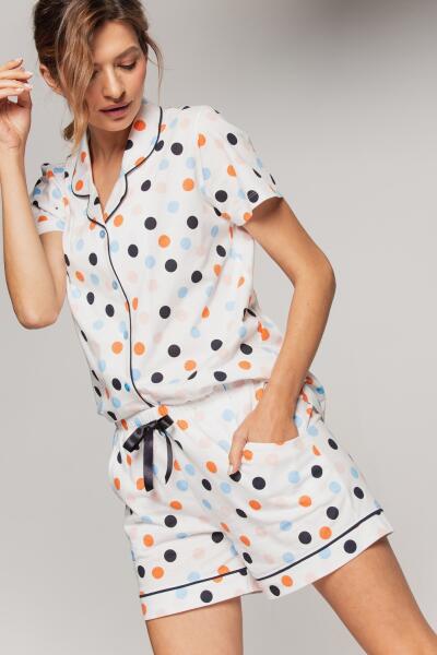 Pöttyös női pizsama. Rövid ujjú, gombokkal rögzíthető póló. Rövidnadrág zsebekkel. Dekoratív szatén masni a derekán. A kiváló minőségű pamut anyag kényelmes viseletet biztosít. Anyaga: 100% pamut