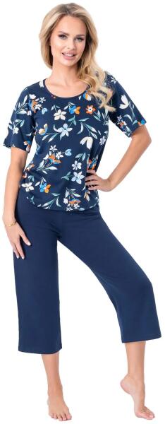 Női pizsama- kiváló minőségű pamut- rövid ujjú póló- virágminta- félkör alakú nyakkivágás- hozzá illő, egyszínű nadrág, 3/4-es hosszúságúÖsszetétel: 100% pamut