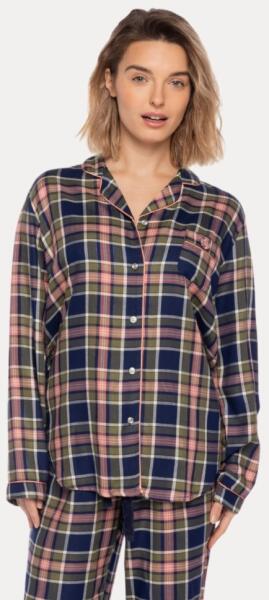 A pizsama egy hosszú ujjú, gombolós felsőből mellzsebbel és klasszikus szabású nadrágból áll. A kockás minta a sötétkék, rózsaszín és olíva árnyalatok kombinációjában egyszerre modern és elegáns. Díszdobozban kapható, így ajándéknak is ideális.