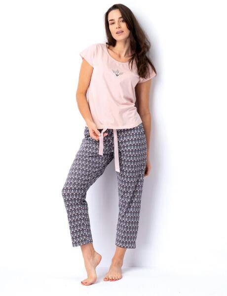 Női nyári pizsama - rövid ujjú póló - félkör alakú nyakkivágás - az elülső részt finom, fényes strasszokkal díszített minta díszíti - mintás, ¾-es nadrág, hogy passzoljon a szetthez - praktikus zsebek - szaténzsinórokkal ellátott öv masni megkötéséhez Összetétel: 95% pamut, 5% elasztán