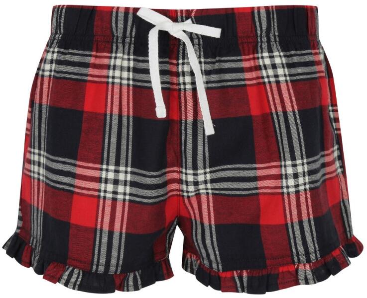 Könnyű és kényelmes női otthoni rövidnadrág, mely akár alvásra is alkalmas. Kellemes pamut flanel szövetből készült, fodros szegéllyel, divatos tartán kockás stílusban. A derékrésze rugalmas és dekoratív kontrasztos színű húzózsinórral van kiegészítve. Praktikus letéphető címke.