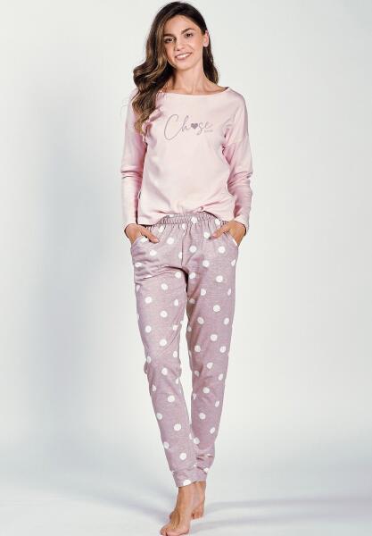 Pamut női pizsama - Hosszú ujjú póló - félköríves nyakkivágás - finom grafika az elején - hosszú nadrág, borsómintás - kényelmes zsebek az oldalán Összetétel: 100% pamut