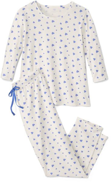 Női 3/4-es ujjú pizsama, szívecskés Szín: Krémszínű, kék nyomott szívecskés mintával Anyag: 95% pamut (ökológiai gazdálkodásból származó), 5% elasztán Méretek: Felsőrész teljes hossza: kb. 64,5 cm (M 40/42-es méret) Nadrág belső szárhossza: kb. 77,5 cm Kellemesen puha pamut-sztreccs anyag3/4-es ujjhosszA nadrág rugalmas derékpánttal és megkötőkkelTartós és rendkívül mosásálló, kiváló minőségű, márkás elasztánnalBiopamuttalEz a hálóruha kíméli a vízkészleteket.