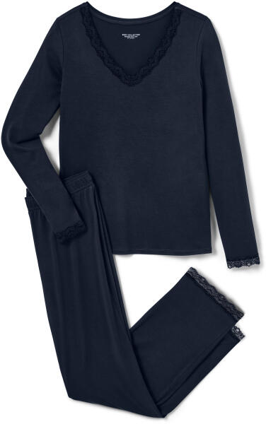 Pizsama csipkerátéttel, sötétkék Szín: Sötétkék Anyag: 58% pamut (támogatja a Cotton made in Africa kezdeményezést), 39% viszkóz, 3% elasztán Csipke: 87% poliamid, 13% elasztán Méretek: Felsőrész teljes hossza: kb. 64,5 cm (M 40/42-es méret) Nadrág belső szárhossza: kb. 73 cm Puha anyag pamutból és viszkózbólA V-nyakkivágás és a nadrágszárvégek finom csipkerátéttelA nadrág rugalmas derékpánttalTartós és a mosást rendkívül jól tűrő, kiváló minőségű, márkás elasztánnalEz a pizsama támogatja a termelőket.