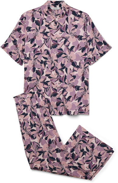 Pizsama Szín: Mályva és rózsaszín nyomott virágmintával Anyag: 97% viszkóz, 3% elasztán Méretek: Felsőrész teljes hossza: kb. 68 cm (40-es méret) Nadrág belső szárhossza: kb. 66 cm Fazon: Regular Fit Hálóruha lágy esésű, szövött viszkóz anyagbólA felsőrész gomboláspánttal és oldalhasítékokkalEgyenes szabású nadrág rugalmas derékpánttalTartós és a rendkívül mosásálló, kiváló minőségű, márkás elasztánnalEz a pizsama tartós fából származó szálakat tartalmaz.