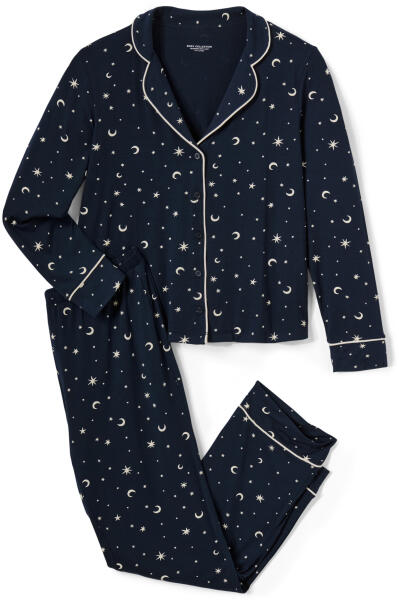 Pizsama, csillagos ég Szín: Sötétkék, csillagos ég nyomott mintával Anyag: 95% modál, 5% elasztán Méretek: Felsőrész teljes hossza: kb. 67,5 cm Nadrág belső szárhossza: kb. 77 cm (M 40/42-es méret) Női hálóruha különösen lágy esésű modál-sztreccs anyagbólFelsőrész végigfutó gomboláspánttal és hosszú ujjakkalEgyenes szabású nadrág rugalmas derékrésszel Tartós és a rendkívül mosásálló, kiváló minőségű, márkás elasztánnalEz a pizsama fenntartható fából származó szálakat tartalmaz.
