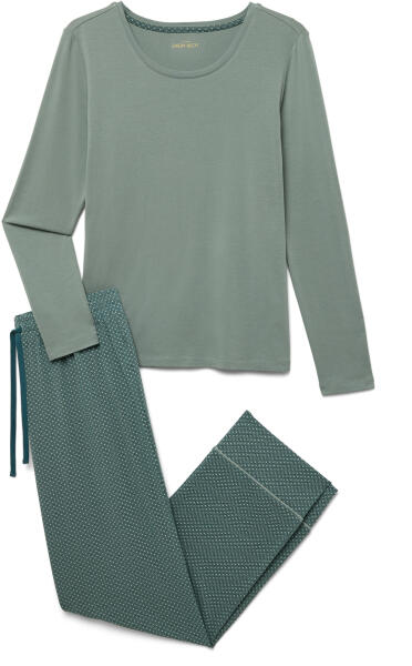 Pizsama Szín: Zsályazöld felső Zsályazöld nadrág nyomott mintával Anyag: 48% pamut (támogatja a Cotton made in Africa kezdeményezést), 47% modál, 5% elasztán Méretek: Felsőrész teljes hossza: kb. 64,5 cm (M 40/42-es méret) Nadrág belső szárhossza: kb. 77,5 cm Fazon: Regular Fit Puha anyag pamutból és modálbólNadrág rugalmas derékpánttal és megkötővel Tartós és rendkívül mosásálló, kiváló minőségű, márkás elasztánnalEz a pizsama támogatja a termelőket.