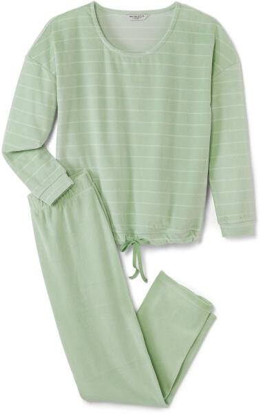 Plüsspizsama, zöld Szín: Felsőrész: világoszöld-krémszínű csíkos Nadrág: világoszöld Anyag: 80% pamut (támogatja a Cotton made in Africa kezdeményezést), 20% poliészter (újrahasznosított) Méretek: Felsőrész teljes hossza: kb. 67 cm (M 40/42-es méret) Nadrág belső szárhossza: kb. 77,5 cm Fazon: Regular Fit Kellemesen puha és melegA felsőrész puha szegélyekkel és megkötővelA nadrág rugalmas derékpánttalÚjrahasznosított anyaggalEz a hálóruha támogatja a termelőket.